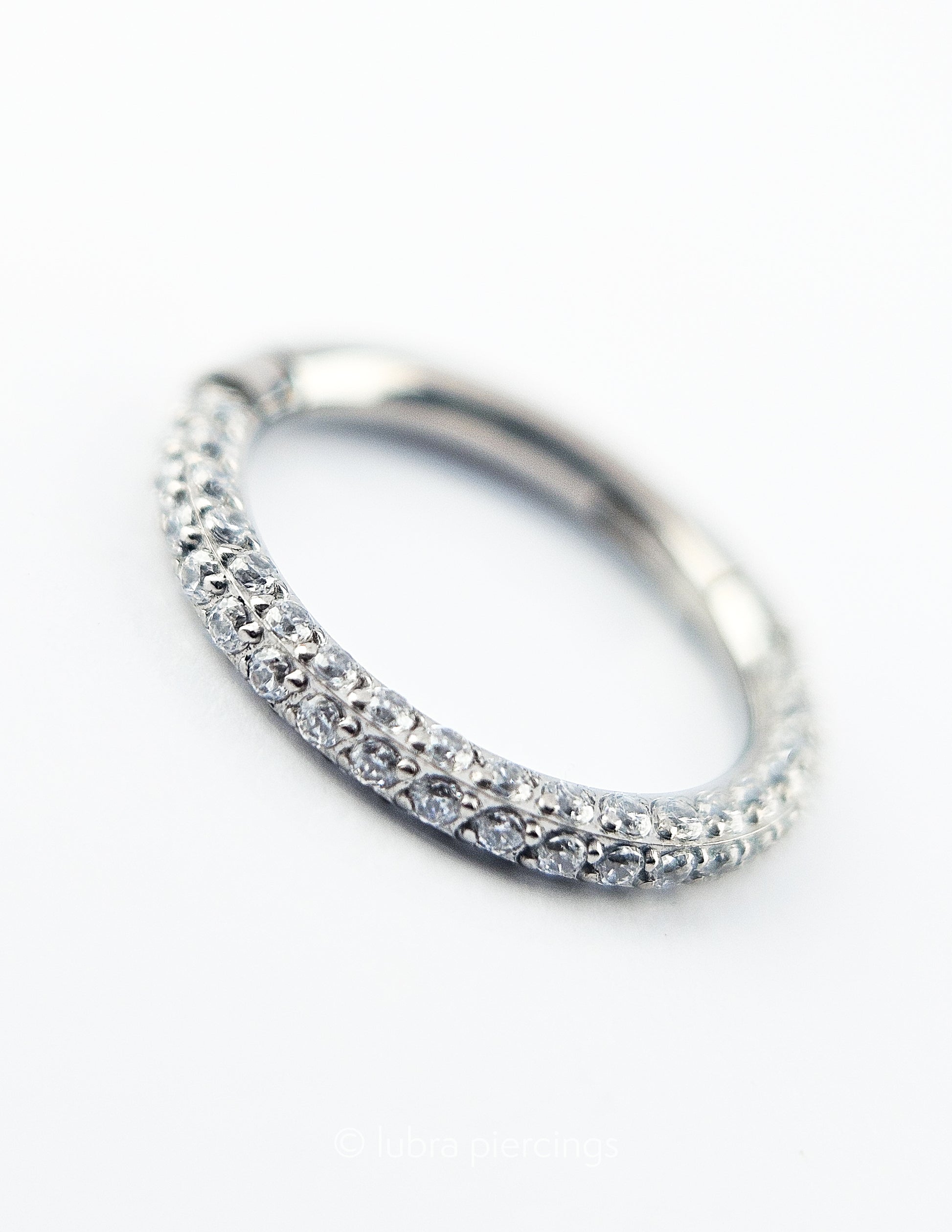 Argola em Titânio ASTM F-136 com fechamento tipo clicker cravejada com zircônias dos 3 lados, proporcionando muito brilho e estilo para suas perfurações.