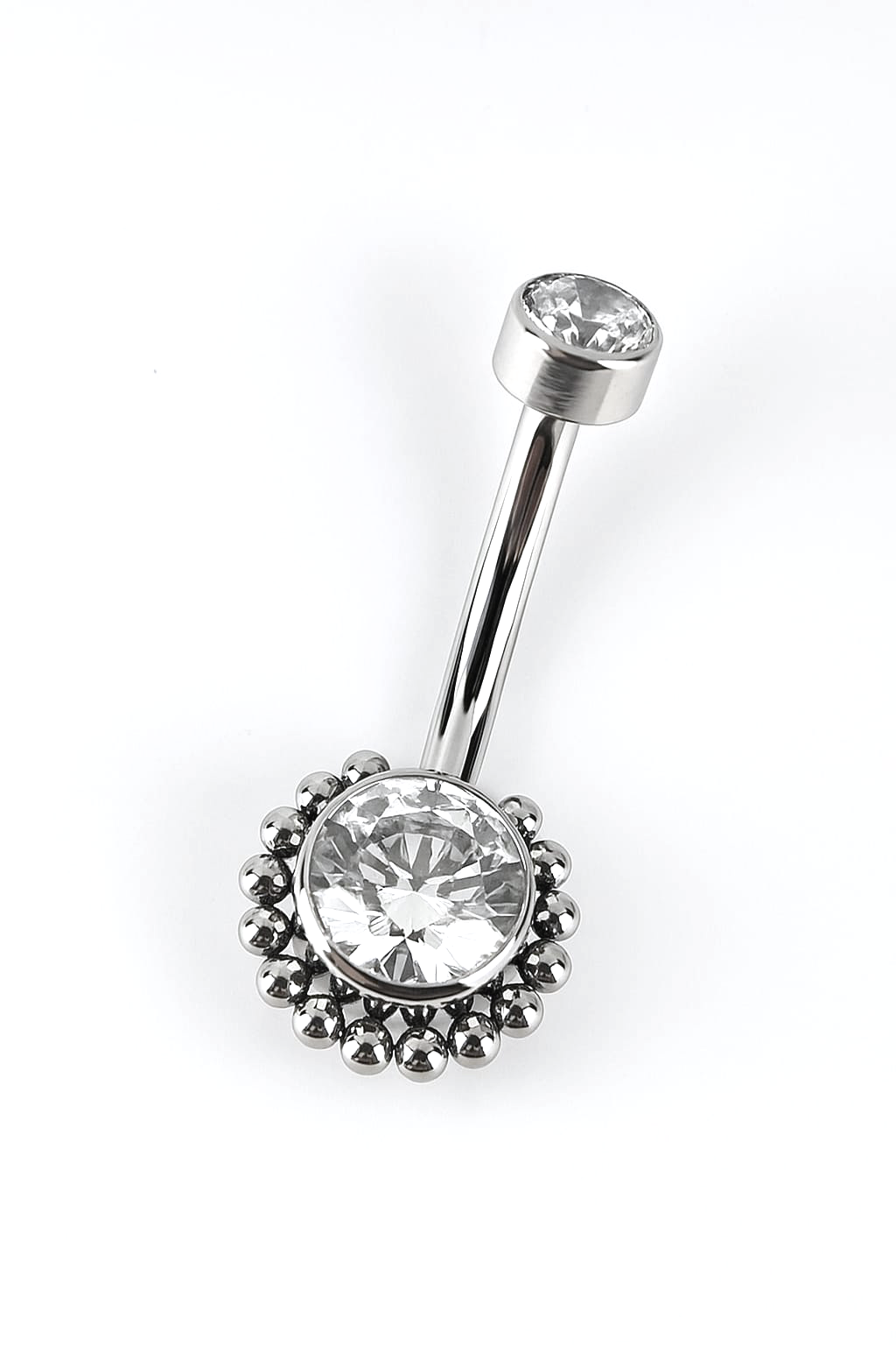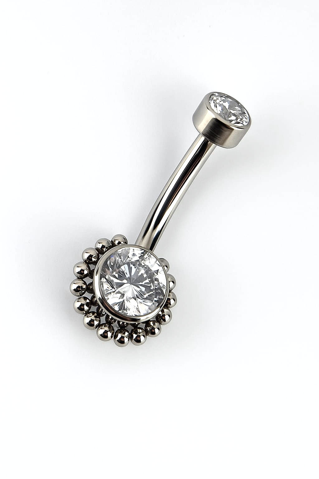 Piercing confeccionado em titânio ASTM F-136, com zircônias, sua forma de abertura é por rosca interna.