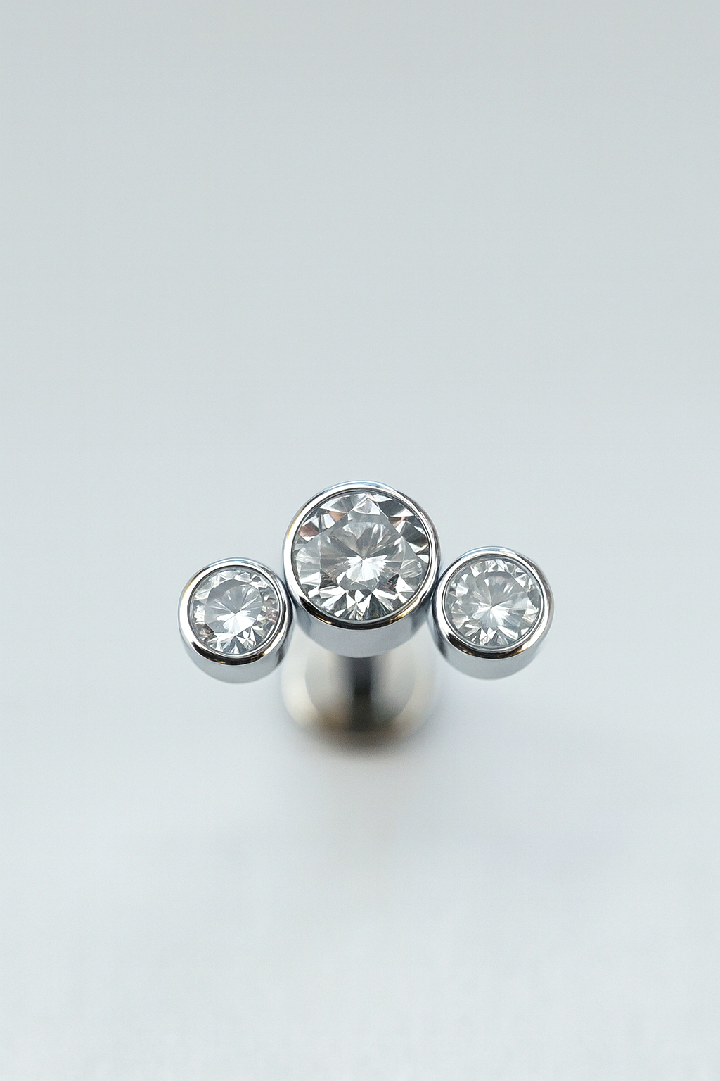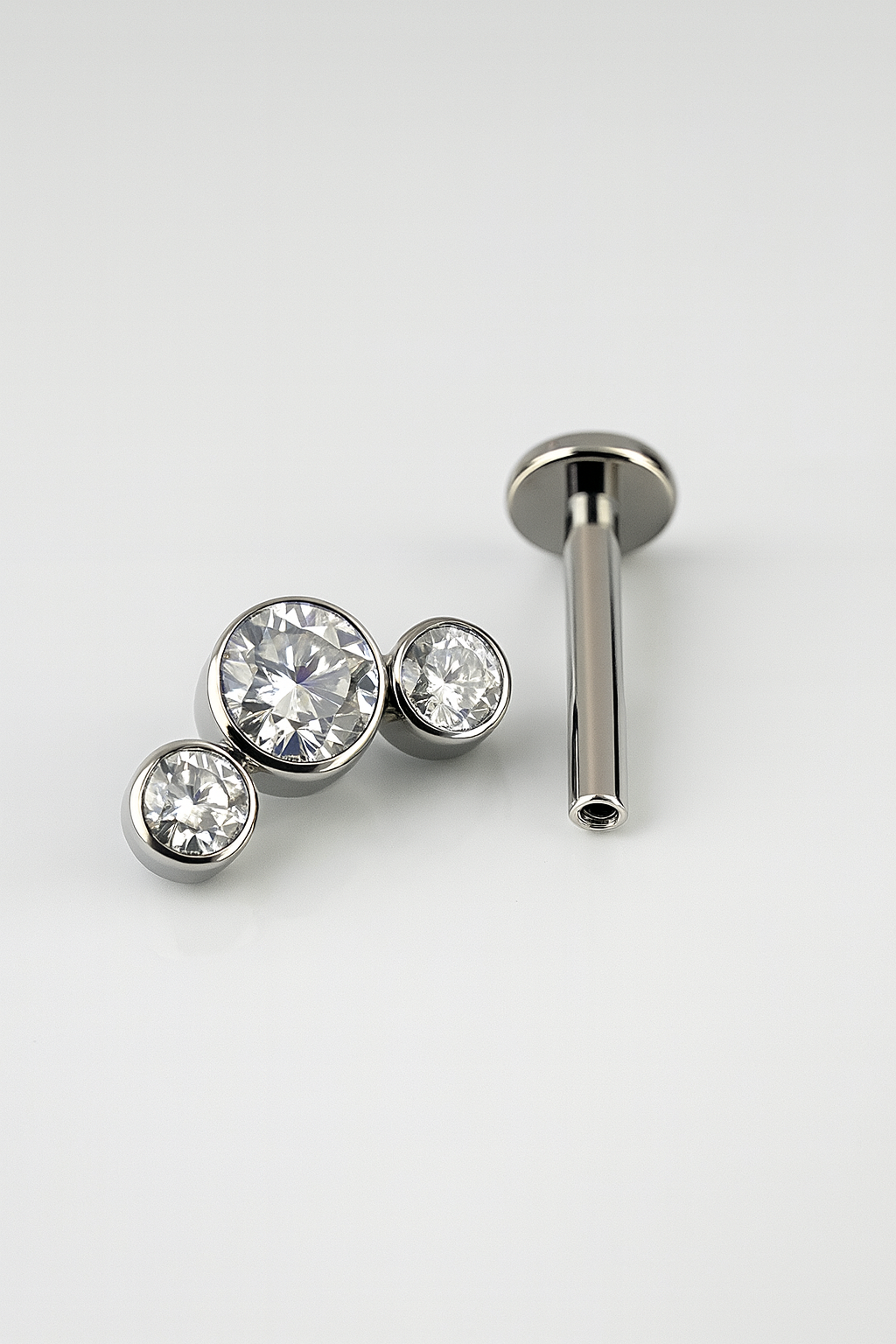 Piercing confeccionado em titânio ASTM F-136, com zircônias, sua forma de abertura é por rosca interna.