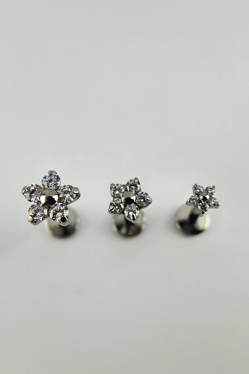Piercing confeccionado em titânio ASTM F-136, com zircônias, sua forma de abertura é por rosca interna.