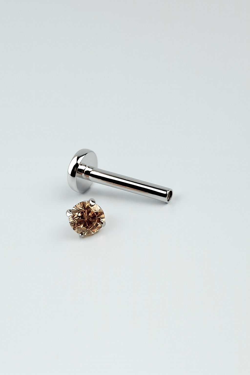 Piercing confeccionado em titânio ASTM F-136, com zircônias champanhe, sua forma de abertura é por rosca interna.