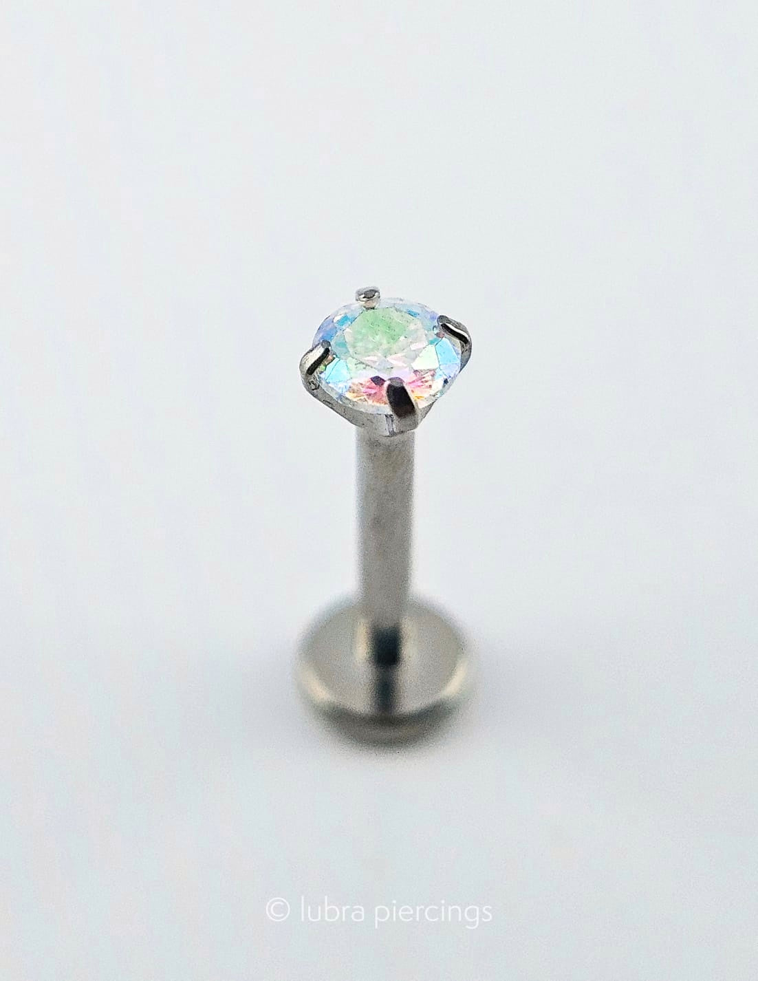 Piercing confeccionado em titânio ASTM F-136, com zircônia furta cor cravada, sua forma de abertura é por rosca interna.
