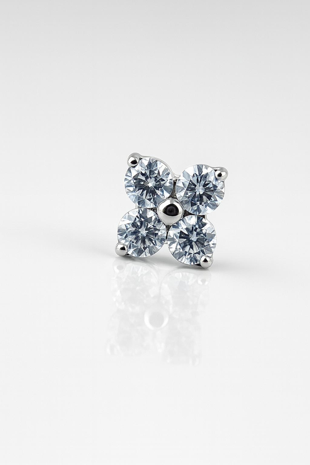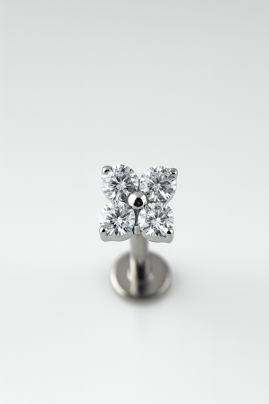 Piercing confeccionado em titânio ASTM F-136, com zircônias, sua forma de abertura é por rosca interna.